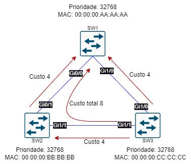 A partir das informações da tabela 1, vemos que o link diretamente conectado do switch 2 até o switch1 possuí custo 4, o mesmo vale para o link diretamente conectado do switch 3 para o switch 1. Qualquer outro caminho irá aumentar esse custo. Por exemplo, vamos imaginar que o switch 3 tente chegar até o root bridge através do switch 2, seu custo total será 8. O mesmo vale para o switch 2 se ele tentar chegar até o root através do switch 3.