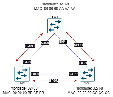 1. Primeiro todos os switches da rede enviam os BPDUs com as informações de endereço MAC e sua respectiva prioridade;