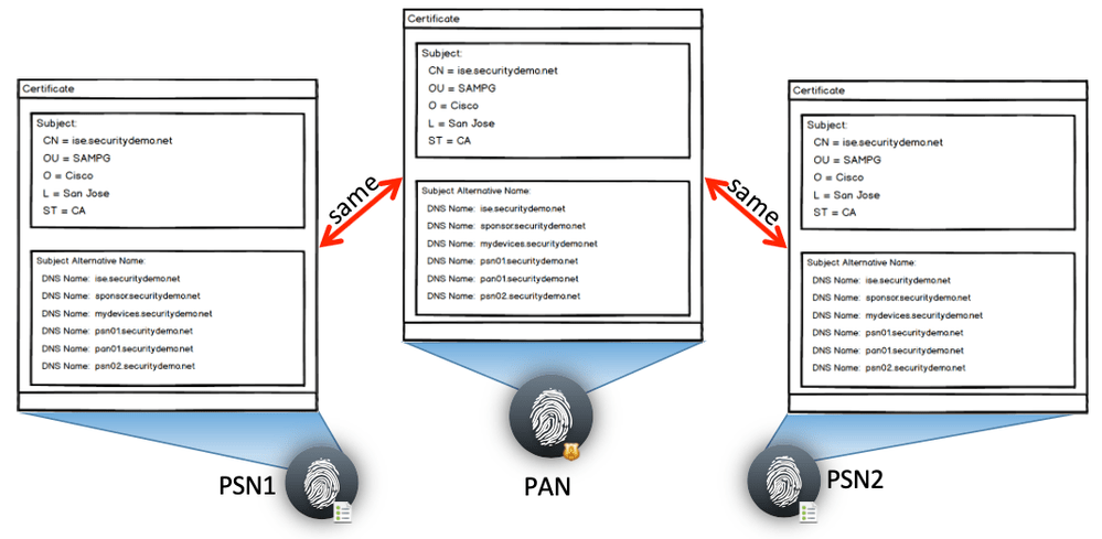 • Este método utiliza o mesmo par de chaves pública e privada em todos os nós ISE. Geralmente, é usado em ambientes com muitos dispositivos do tipo BYOD. O principal motivo para seguir este modelo é garantir que o mesmo certificado seja usado em todas as PSNs; assim, os dispositivos BYOD já confiarão em qualquer servidor EAP no qual precisem se autenticar.