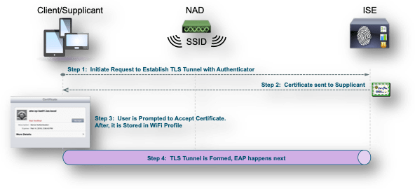 Com métodos EAP tunelados, como PEAP e FAST, o protocolo TLS (Transport Layer Security) é usado para proteger a troca de credenciais. Assim como ao acessar um site HTTPS, o cliente estabelece a conexão com o servidor, que apresenta seu certificado ao cliente. Se o cliente confiar no certificado, o túnel TLS é formado. As credenciais do cliente não são enviadas ao servidor até que esse túnel seja estabelecido, garantindo assim uma troca segura. Em uma implantação de Acesso Seguro, o cliente é um solicitante e o servidor é um nó do ISE Policy Services.