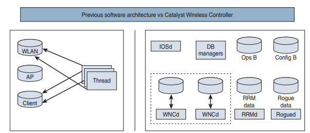 A antiga arquitetura à esquerda (IOS) comparada com a arquitetura Catalyst Wireless à direita (IOS-XE)