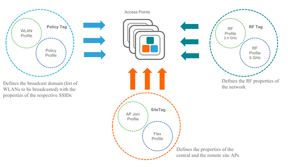 Com o WNCd como orquestrador da inteligência wireless, ele precisa de instruções estruturadas e reutilizáveis para aplicar as configurações de rede, rádio e controle aos APs. Essas instruções vêm na forma de Tags.